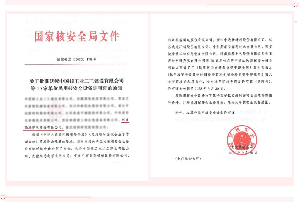 2018年10月,河南奇异果(中国)QIYIGUO官方网站电气股份有限公司获得国家核安全局颁发《民用核安全设备设计许可证》及《民用核安全设备制造许可证》。期间我们参与了福建霞浦核电站、秦山核电站、山东海阳核电站等多个核电项目的建设,核电产品的设计质量、制造质量和服务质量得到客户的高度评价。五年后,国家核安全局经过严格的评审,批准延续我公司民用核安全设备设计和制造许可证。许可证有效期延续至2028年9月30日。