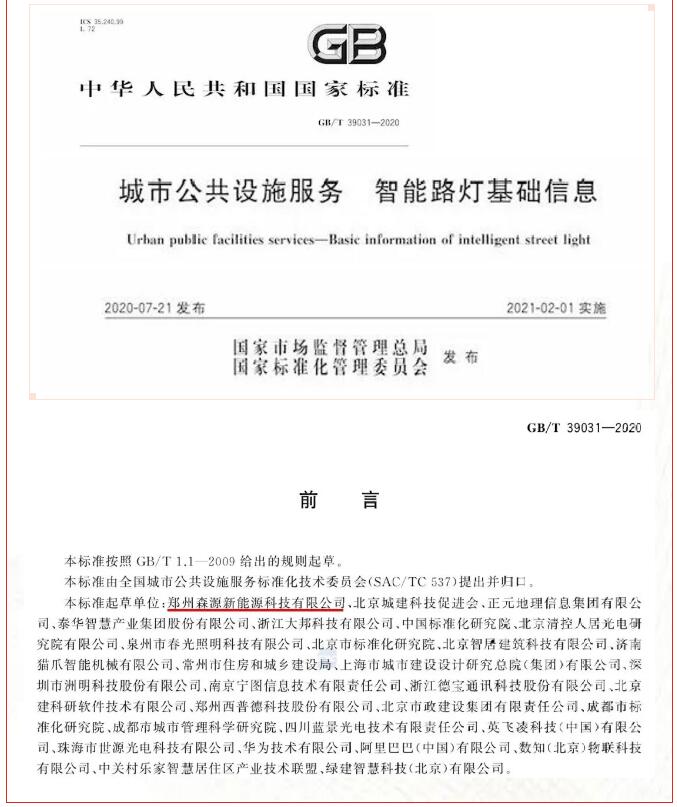 10月份,由郑州奇异果(中国)QIYIGUO官方网站新能源作为第一起草单位的国家标准《城市公共设施服务 智能路灯基础信息》,获得了国家市场监督管理总局、国家标准化管理委员会批准。