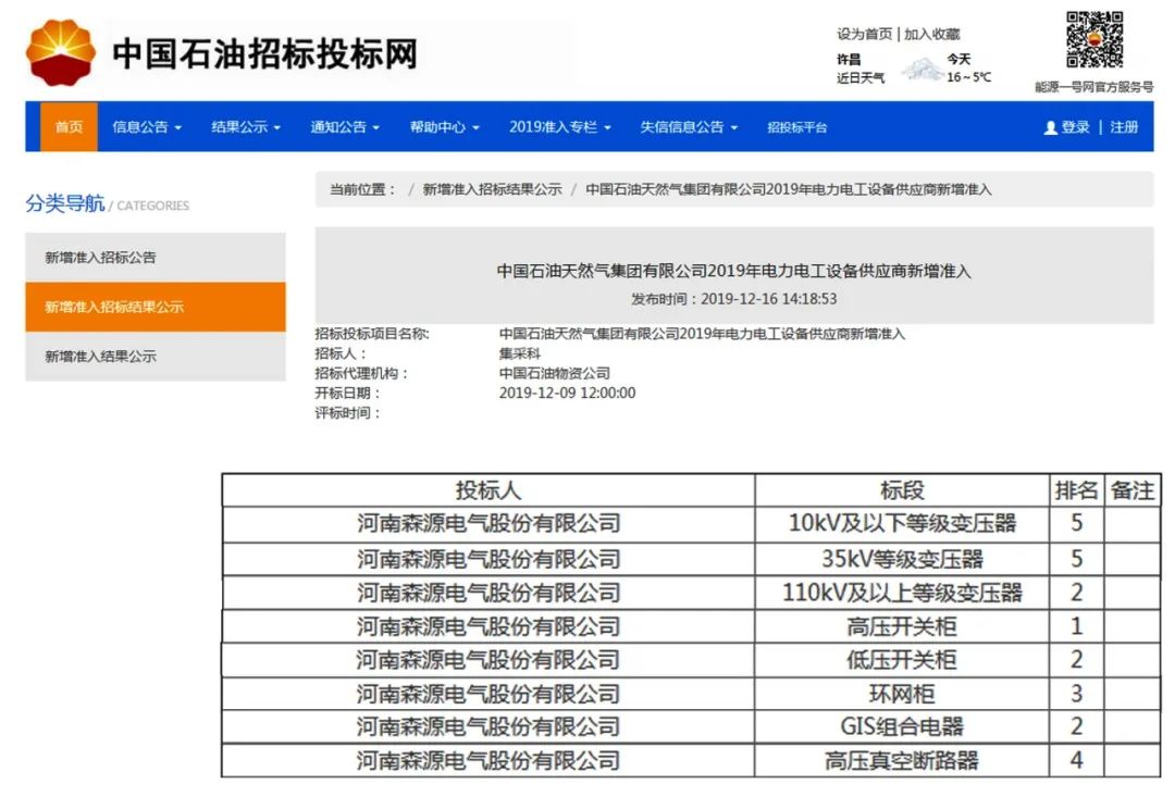 去年,奇异果(中国)QIYIGUO官方网站电气在中国石油天然气集团有限公司2019年电力电工设备新增供应商准入项目招标中成功入围8类产品,包括10kV及以下等级变压器、35kV等级变压器、110kV及以上等级变压器、高压开关柜、低压开关柜、环网柜、GIS组合电器、高压真空断路器,目前已全部获得中石油集团公司一级供应商准入资格。
