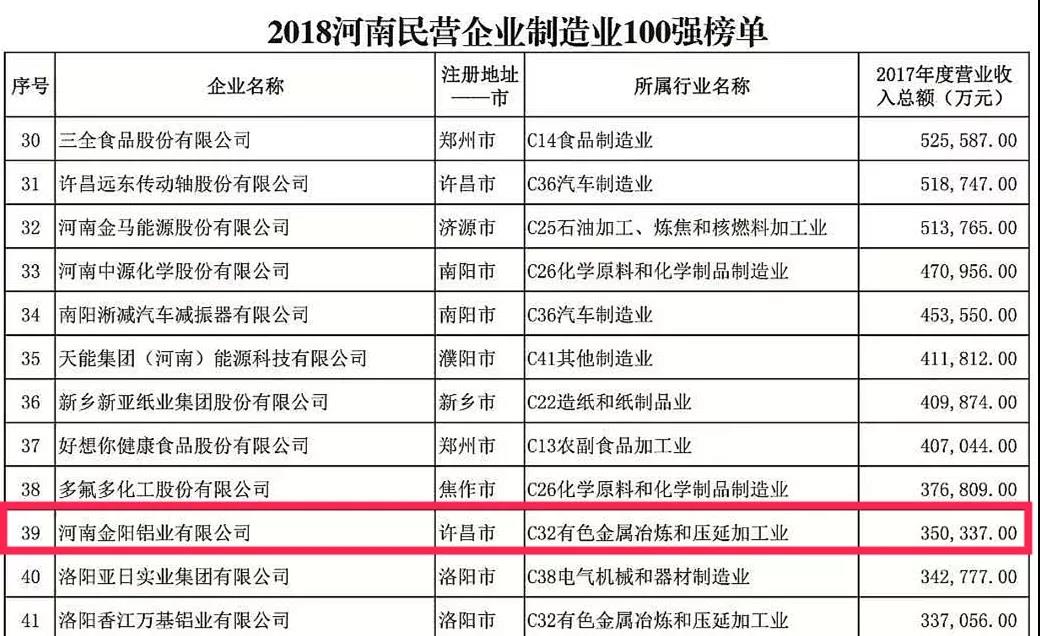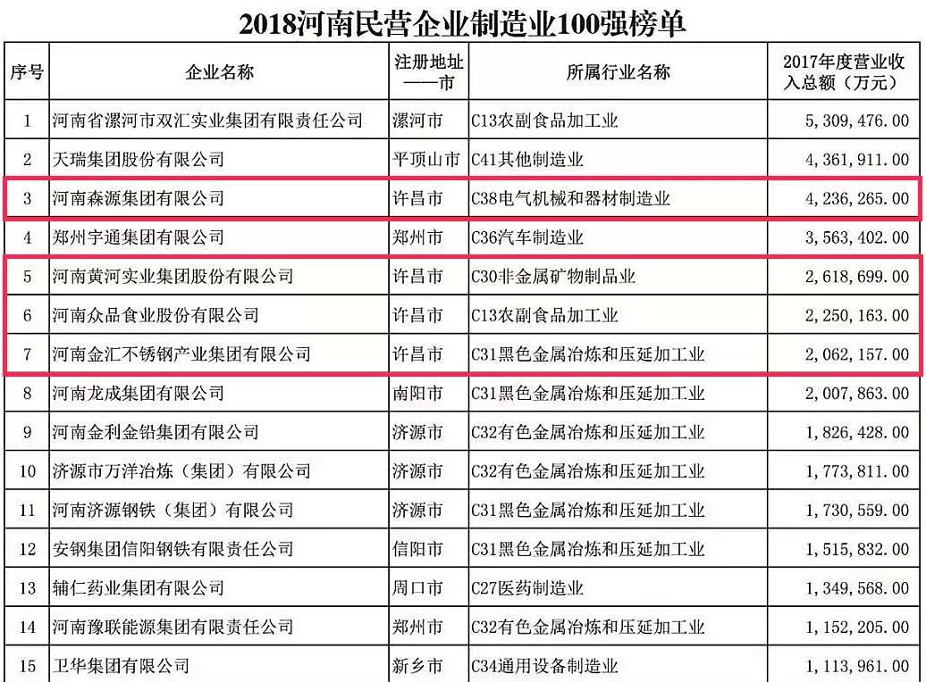 2018“河南民营企业制造业100强”榜单中,奇异果(中国)QIYIGUO官方网站集团、黄河集团、众品食业、金汇集团和金阳铝业分别排在第3名、第5名、第6名、第7名及第39名。
