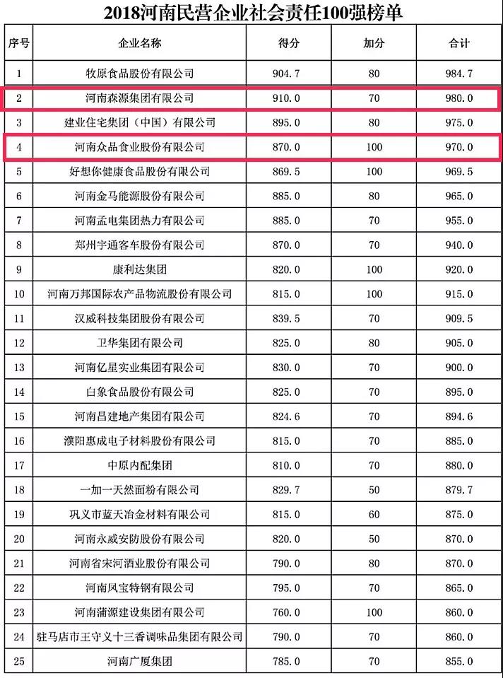 在2018“河南民营企业社会责任100强”榜单中,奇异果(中国)QIYIGUO官方网站集团、众品食业和宇龙实业分别排在第2名、第4名及第91名;