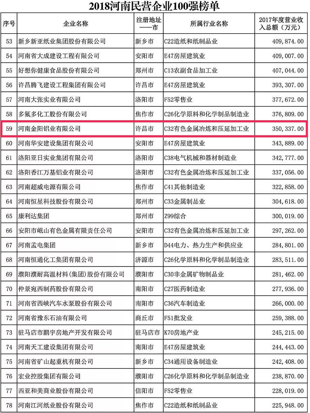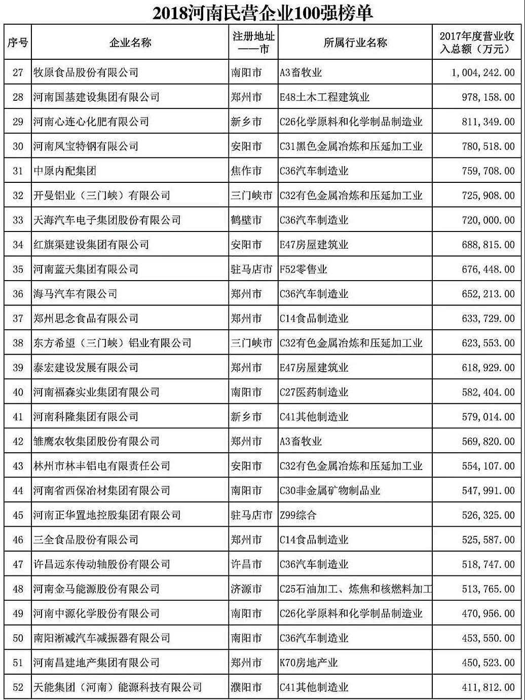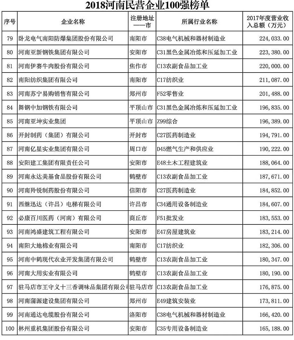 附:2018“河南民营企业100强”榜单