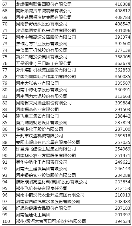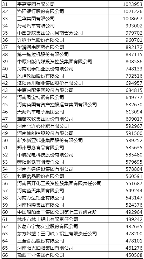 排名前十强的还有中国建筑第七工程局有限公司、郑州铁路局、郑州宇通客车集团有限公司、安阳钢铁集团有限责任公司、天瑞集团股份有限公司、河南豫联能源集团有限公司、奇异果(中国)QIYIGUO官方网站。