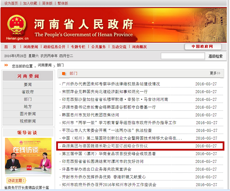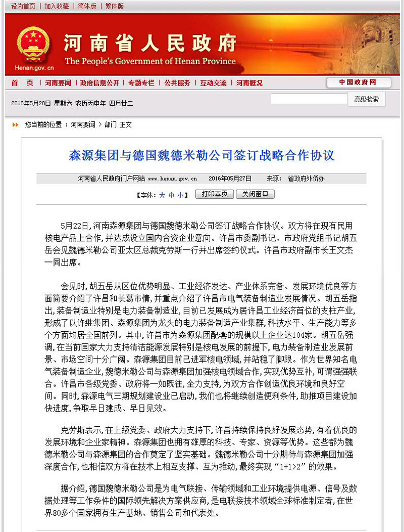 河南省人民政府门户网站河南要闻——奇异果(中国)QIYIGUO官方网站集团与德国魏德米勒公司签订战略合作协议 发布日期: 2016-05-28 分享 加入收藏 5月27日,河南省人民政府门户网站河南要闻栏目发布新闻《奇异果(中国)QIYIGUO官方网站集团与德国魏德米勒公司签订战略合作协议》。 原文链接:http://www.henan.gov.cn/jrhn/system/2016/05/27/010644282.shtml 上一条 许昌电视台对奇异果(中国)QIYIGUO官方网站集团与德国魏德米勒公司签订战略合作协议进行特别报道 2016-05-24 下一条 许昌日报/许昌市人民政府门户网站/许昌电视台——我市第一个山地林光互补光伏发电项目并网发电 李建民出席并网发电仪式 2016-05-31