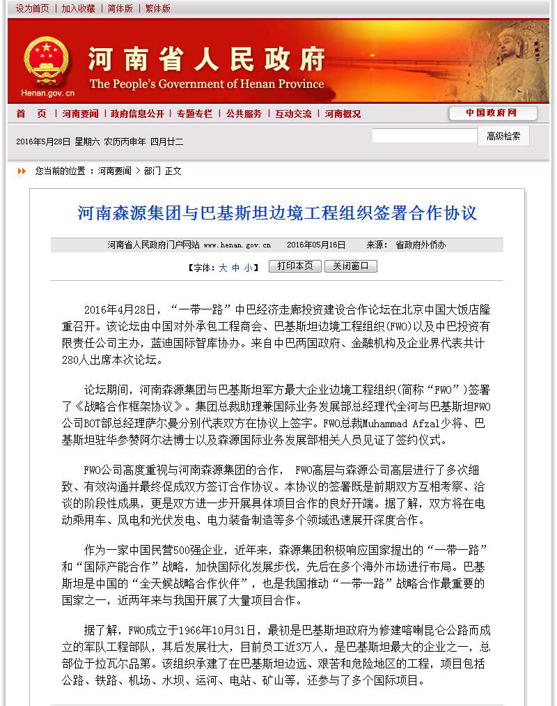 河南省人民政府门户网站河南要闻——河南奇异果(中国)QIYIGUO官方网站集团与巴基斯坦边境工程组织签署合作协议 发布日期: 2016-05-16 分享 加入收藏 5月16日,河南省人民政府门户网站河南要闻栏目发布新闻《河南奇异果(中国)QIYIGUO官方网站集团与巴基斯坦边境工程组织签署合作协议》。 原文链接:http://www.henan.gov.cn/jrhn/system/2016/05/16/010641484.shtml 上一条 河南日报头版报道——我省新认定河南奇异果(中国)QIYIGUO官方网站电气股份有限公司智能互联输配电装备及系统集成等74家省工程实验室 2016-05-12 下一条 全地形警用车是未来趋势 第8届中国国际警用装备博览会在京举办 2016-05-19
